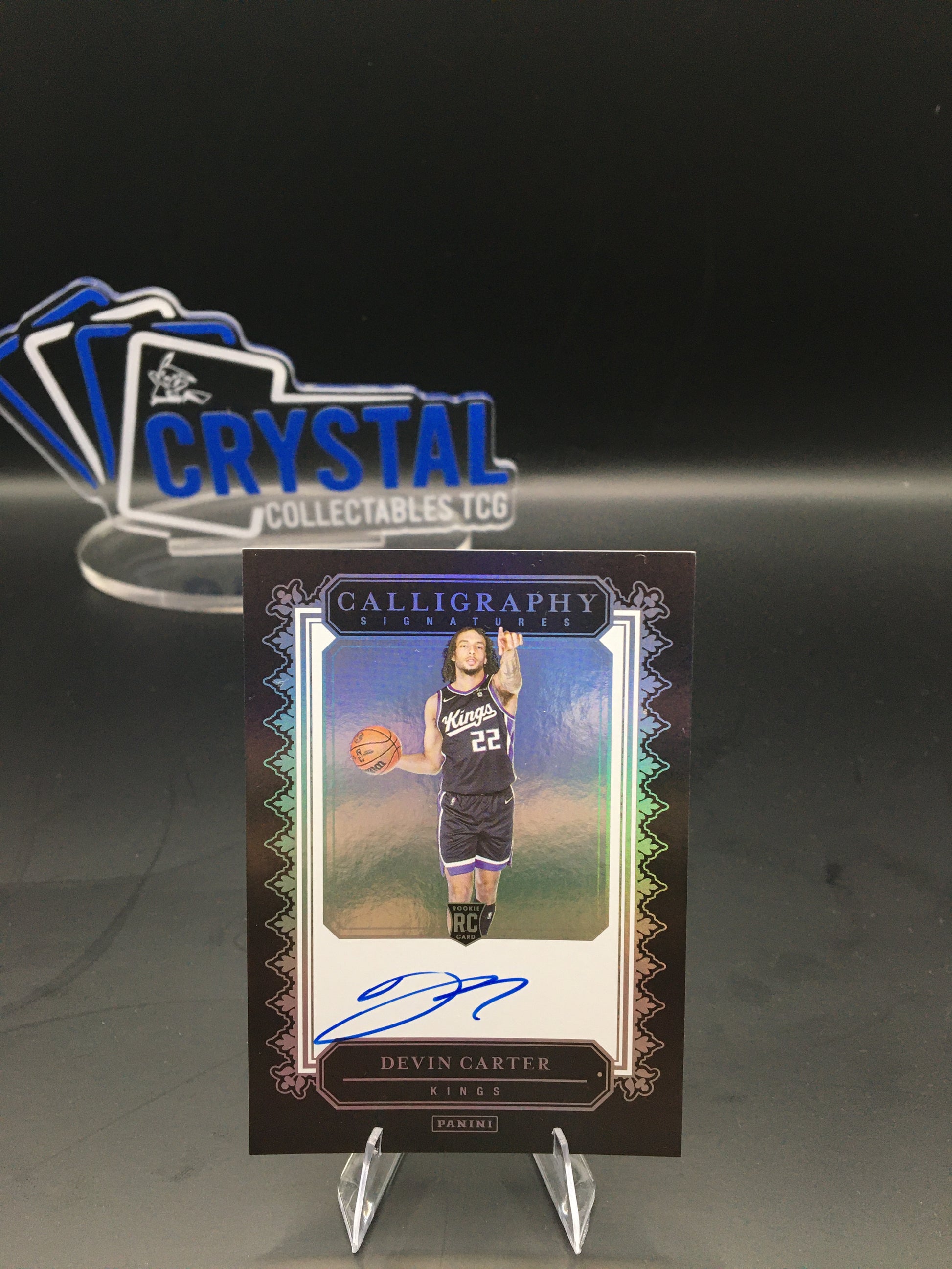 Add an elegant rookie autograph to your collection with this Devin Carter Calligraphy Signatures Rookie Auto from Panini. Featuring the premium Calligraphy design with ornate borders and a bold blue on-card signature, this card showcases Carter in his Sacramento Kings uniform and delivers strong visual appeal for any basketball collection.